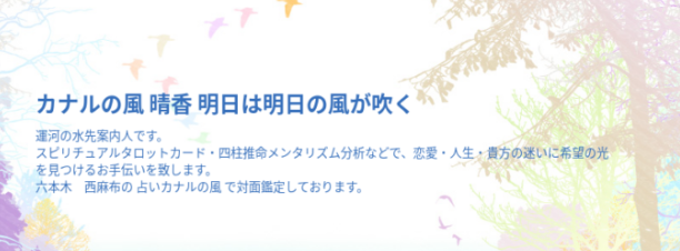 | 鑑定料金 | 対面カウンセリング:50分12,000円 電話相談:10分2,000円 |